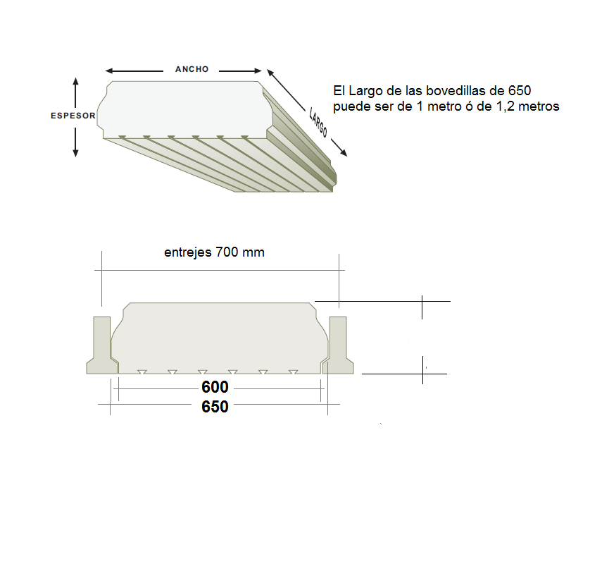 Los largos de las bovedillas del ancho 650 pueden ser de 1 metro a 1,2 metros dependiendo del grosor de la bovedilla y los